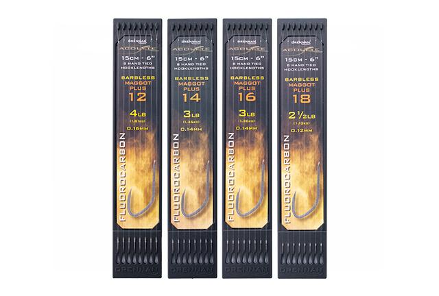 Size 12 tied to 0.16mm 4lb. Size 14 tied to 0.14mm 3lb. Size 16 tied to 0.14mm 3lb. Size 18 tied to 0.12mm 2lb 8oz. The unique hook plate system keeps hooklengths perfectly straight and ready to use, these are fully compatible with the Drennan Hook Book and Hook Box for the ultimate storage solution.
